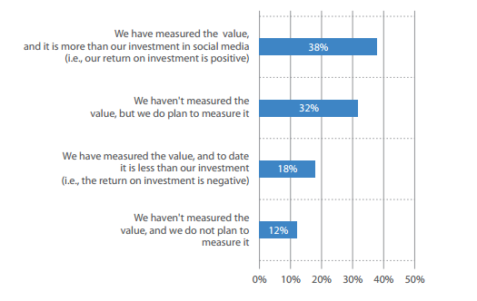 1. 38% of consumer companies report a positive return on their social media investments – more than double the number of companies with a negative ROI – but 44% haven’t measured the return. The number of companies with a negative ROI on social media is 18%. Asia-Pacific and Latin American companies are more likely to report positive ROI on social media than companies in North America and Europe.