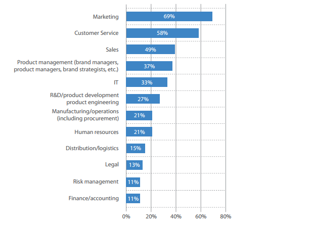 6. Only three business functions are actively involved in monitoring what consumers say about their firm through social media; marketing, customer service and sales: These functions regularly track what consumers are saying on social media in a majority or near majority of consumer companies.