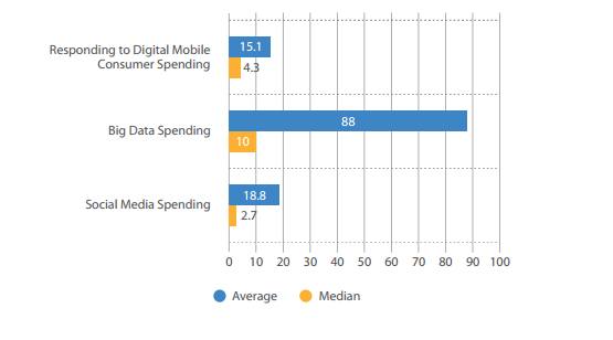 9. Companies are investing fewer resources on social media than they are on Big Data (based on previous TCS studies): Median spending this year on social media is $2.7 million per respondent (average is about $19 million). Based on the median number, these companies will invest about a fourth of what they spent in 2012 on Big Data (median of $10 million), and about 37% less than what they spent last year on responding to consumers who want to do business with them through mobile devices.